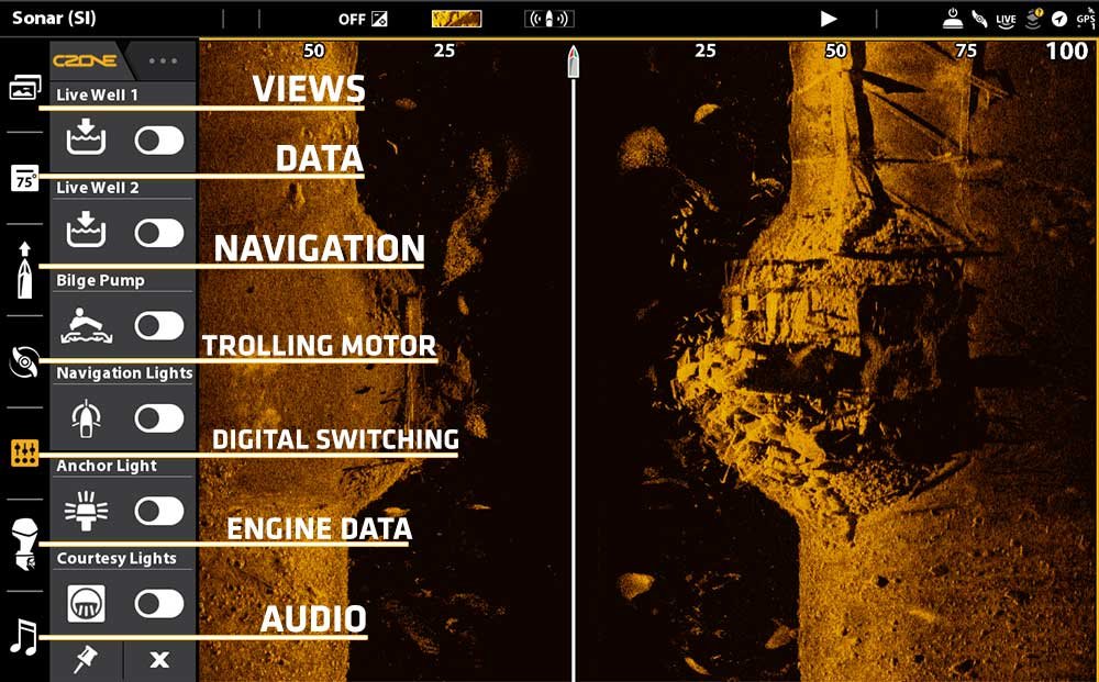 A Barra Lateral nas unidades SOLIX e APEX apresenta várias ferramentas, visualizações e widgets de barra lateral. As opções disponíveis na barra lateral são determinadas pelo equipamento conectado à rede do cabeçote de controle. Algumas das possíveis opções da barra lateral incluem: Favorite Views, Data, Navigation, Trolling Motor Control, Shallow Water Anchor Control (Raptor & Talon), Downrigger Control, Digital Switching (Luzes do barco, bomba de porão, buzina, etc.), Engine Data (NMEA 2000) e Audio Accessory Control.